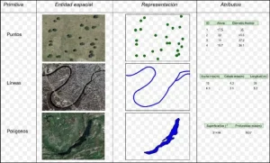 Con este modelo se persigue la representación vectorial de la información espacial. Es preciso recordar el concepto de vector como segmento definido por dos puntos, uno inicial y otro final que definen su tamaño, su dirección y su sentido. Así, podemos aproximarnos a la estructura vectorial pensando que cada punto de la realidad queda definido por unas coordenadas X e Y y pertenece siempre a un elemento geográfico (punto , línea o polígono). Los objetos quedan definidos de la siguiente manera: